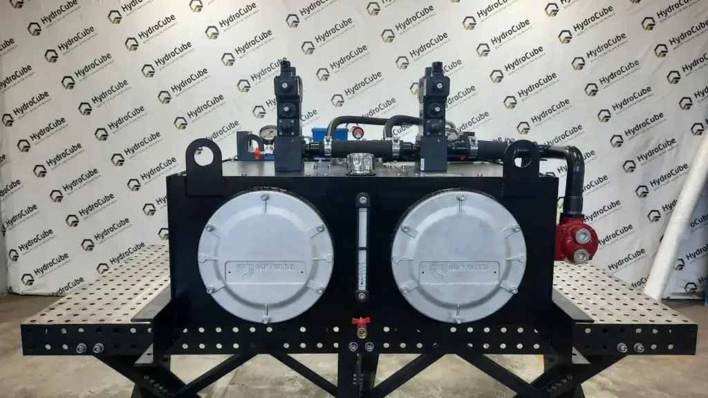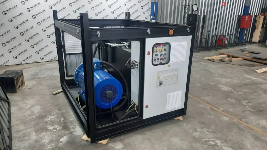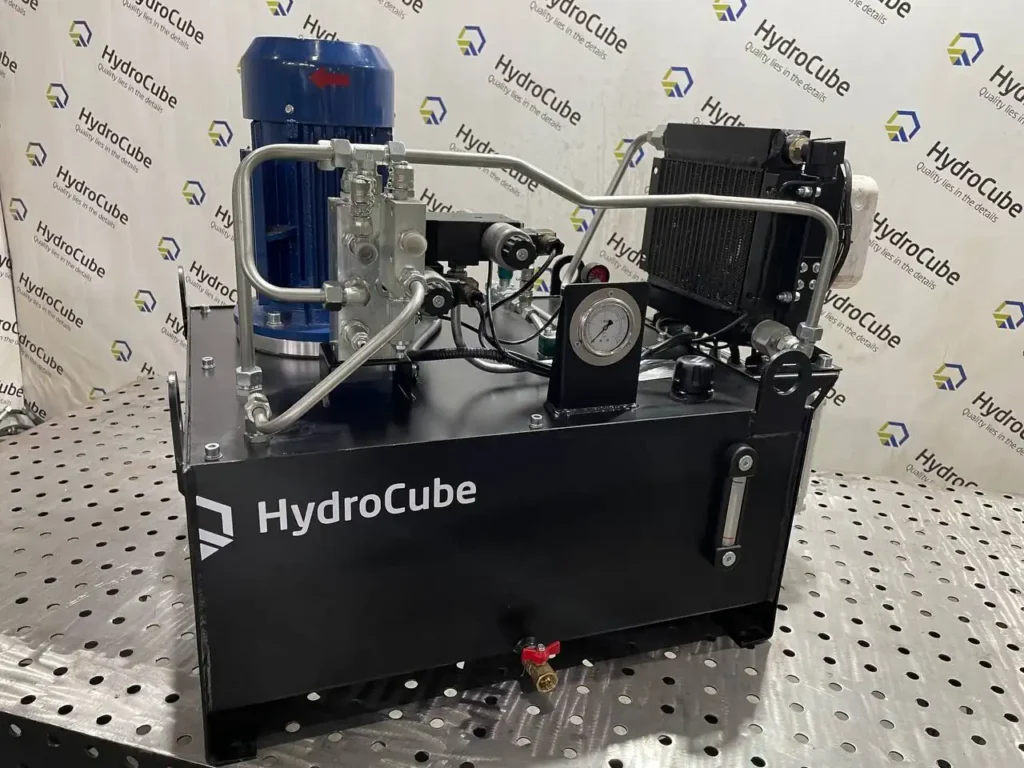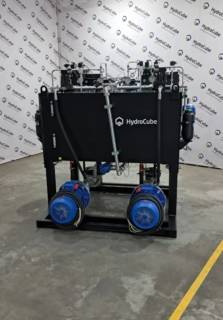 Гидростанция HydroCube включает насосный модуль, масляный бак и фильтрацию. Работа обеспечивается электрическим двигателем от сети в двести двадцать вольт, что делает установку удобной для промышленного применения.