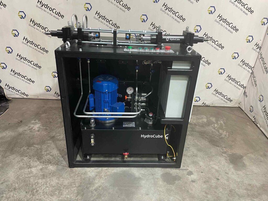 Гидростанция сверхвысокого давления включает насосный модуль, маслобак, систему фильтрации и узлы подачи жидкости. Компактная компоновка облегчает обслуживание и повышает надёжность, а узлы проходят испытания на стендах HydroCube для подтверждения соответствия проектным параметрам.